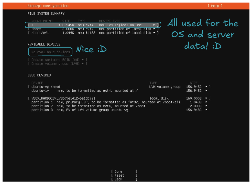 For the storage configuration part, by default, it does not utilize all the disk space. You can see this in the free space field in the DEVICE section: