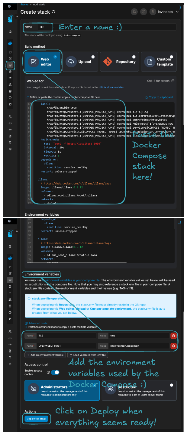 This section aims to demonstrate how to properly install a stack of containers for a given application and expose it to the Internet. LLMs are hot topics nowadays, so let's use the Open WebUI and Ollama stack as an example.