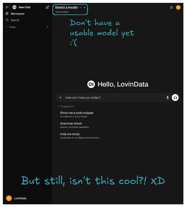 Make sure your DNS provider has llm.mydomain.topdomain routed to your ISP router, just like Portainer and Traefik were set up in the previous section. After that, you should be able to navigate to 'llm.mydomain.topdomain', and by configuring your admin account (mandatory on first page load), you should end up on the following page: