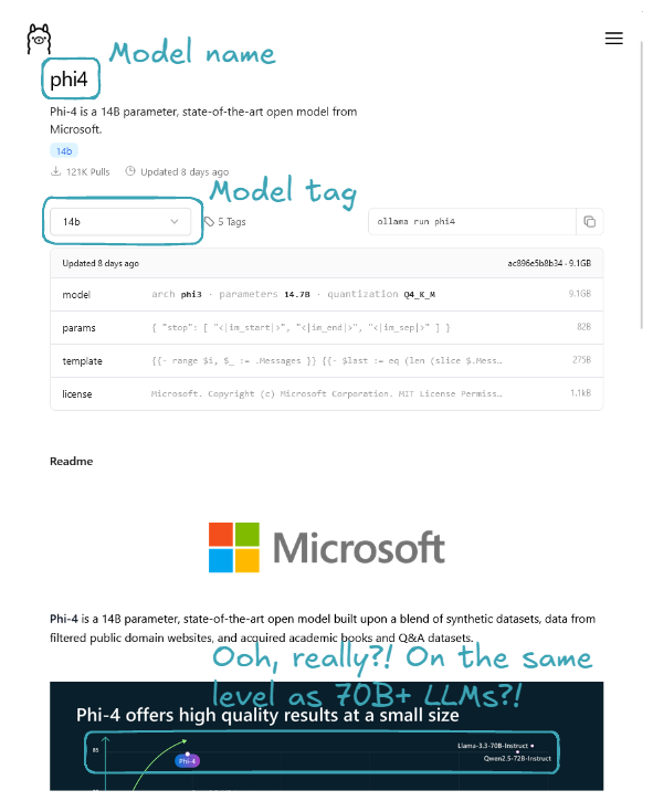 Let's now download the latest Phi-4 with its 14 billion parameters, rumored to rival OpenAI's GPT-4o mini, which everyone is talking about. You can also try other LLMs instead; models are available in the Ollama Models section.