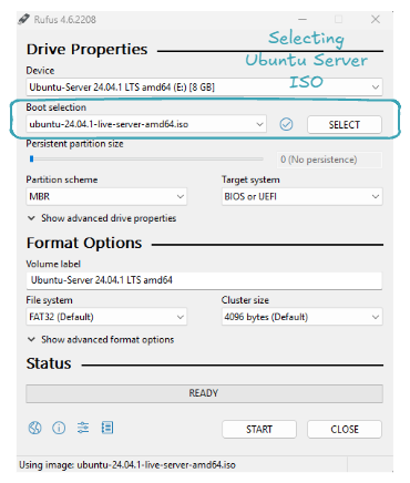 Now it's time to create a bootable USB key with the Ubuntu Server ISO. Plug in your USB key, open Rufus, and for Boot selection, select the downloaded Ubuntu Server ISO. Hereโs what your configuration should look like: