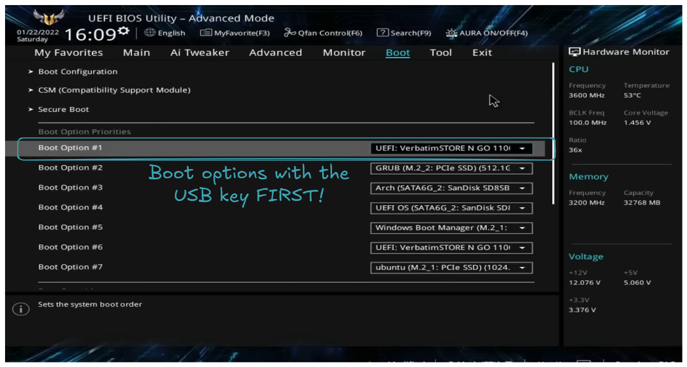Start by plugging the USB key, then turn ON the machine and open the BIOS. To open the BIOS, restart your PC and press the designated key (commonly F2, F12, Delete, or Esc), which depends on your PC's manufacturer.