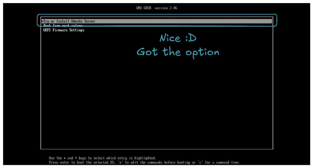 As explained on the screen, the USB key is set as the first boot option. Then restart the machine, you should be welcomed with the choice: Try or install Ubuntu Server.